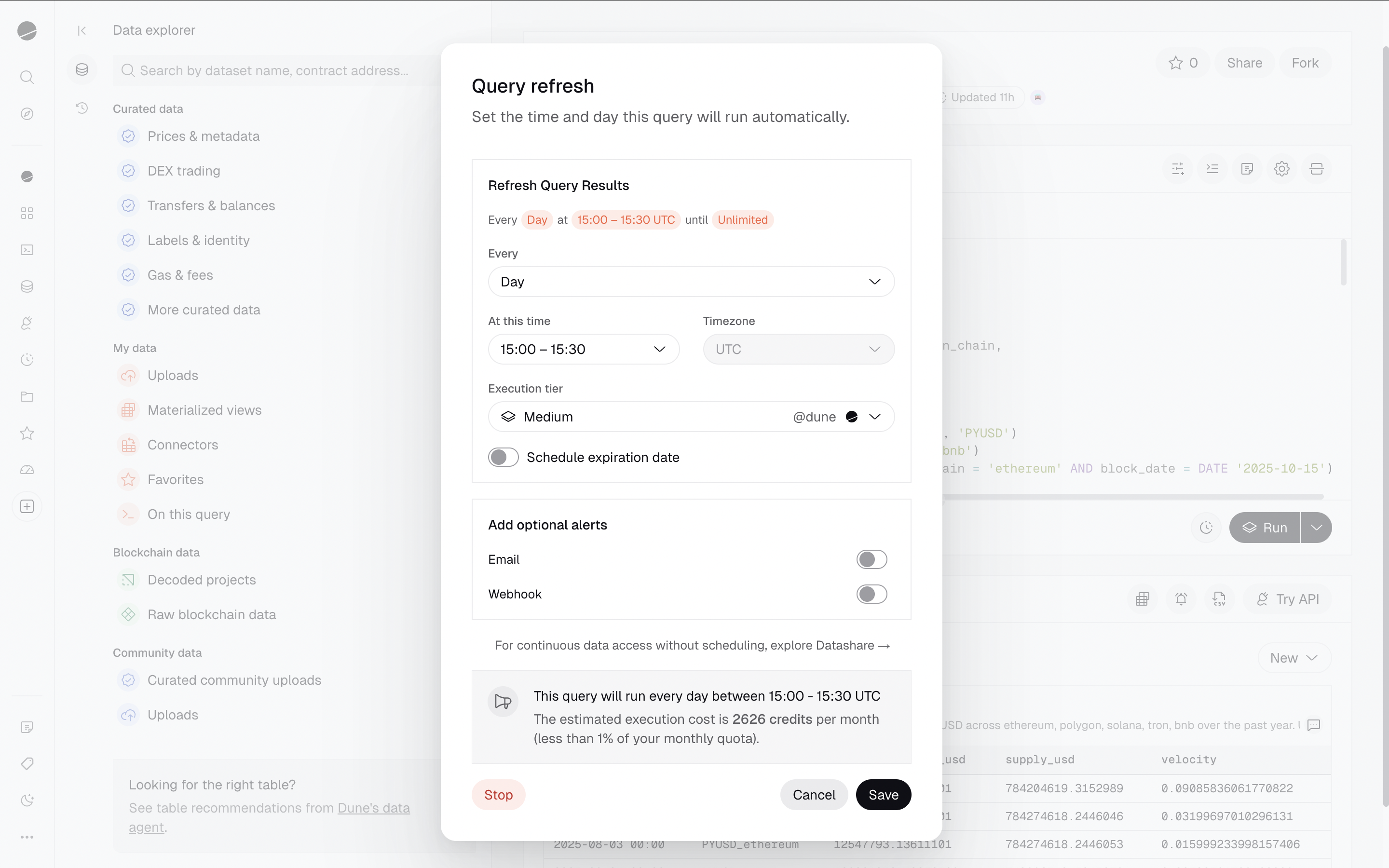To modify or cancel a query schedule, click the scheduler (clock) icon again to reopen the scheduling dialog. From there you can adjust the frequency, time, or execution tier. To stop the schedule entirely, scroll to the bottom of the dialog and click the Stop button.